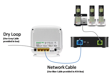 If you internet is functioning but your phone device says "device not registered" when you lift the handet, power cycle the VoIP ATA by pulling the black power cord out of the unit (it has a mini usb plug on it), wait 10 seconds then plug it back in.